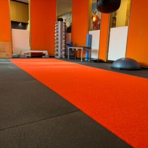 Rubberen tegels sluiten strak op elkaar aan en zorgen voor een hygiënische, nette en moderne look. Dit versterkt de professionele uitstraling van de praktijk en geeft rust in de sportruimte.