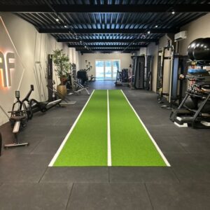 De tracks zijn ook een echte eyecatcher en geven de ruimte een professionele, moderne uitstraling. Dankzij het hoogwaardige rubber bieden ze goede grip en bescherming van de ondervloer. Bovendien is er veel flexibiliteit in belijning en kunnen wij een ontwerp op maat maken dat volledig aansluit bij jouw praktijk en trainingsdoelen.
