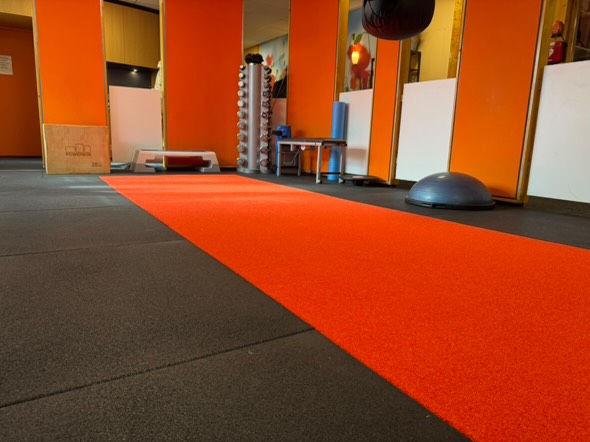 Rubberen tegels sluiten strak op elkaar aan en zorgen voor een hygiënische, nette en moderne look. Dit versterkt de professionele uitstraling van de praktijk en geeft rust in de sportruimte.