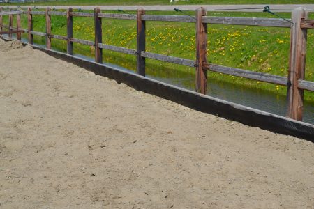 Een rubberen zandkering van gebruikte of nieuwe transportband is een slimme en veilige oplossing voor uw paddock. Dit materiaal is uiterst sterk, duurzaam en vriendelijk voor uw paard. Als een paard per ongeluk tegen of buiten de zandkering stapt, biedt het rubber bescherming tegen blessures – in tegenstelling tot hout of kunststof dat harder en splintergevoeliger is.